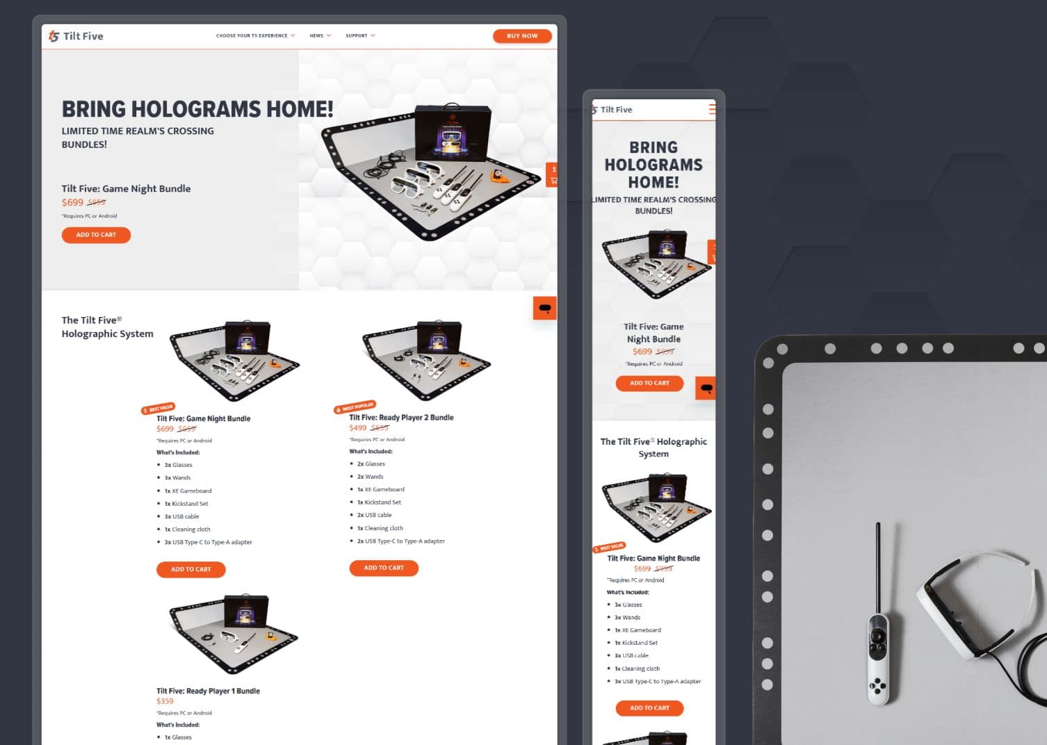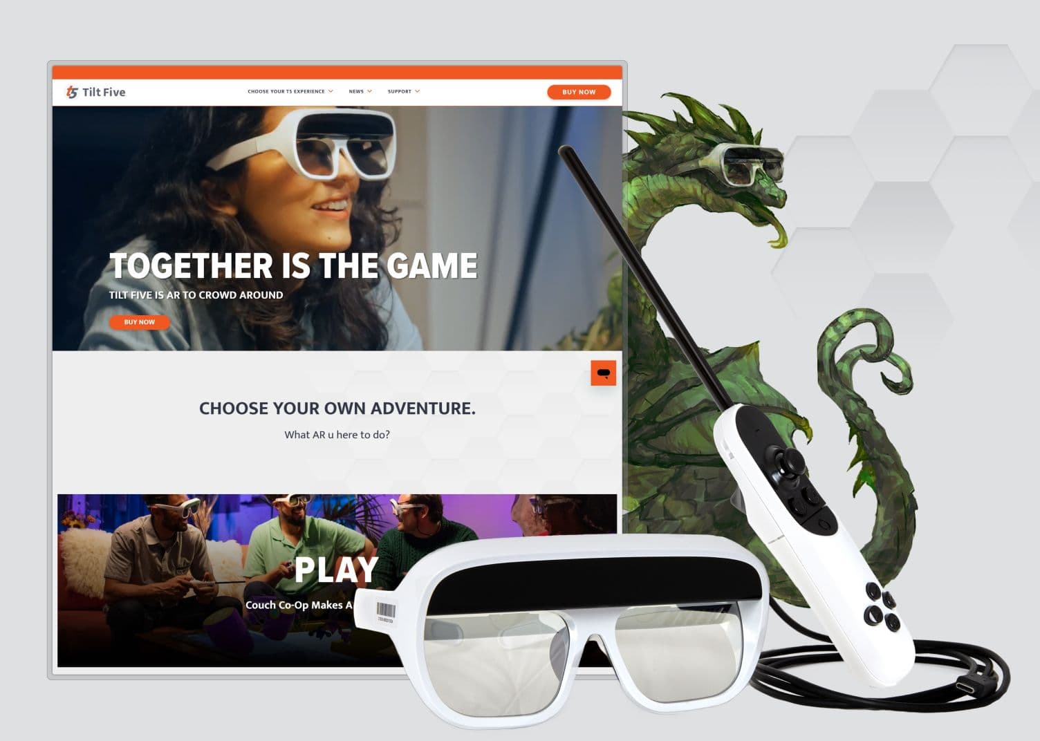 - A true innovation start-up, Tilt Five has reinvented tabletop gaming with AR and holograms. Tilt Five aimed to attract hardcore gamers and potential investors. Our challenge was to support them with a website and creative that not only highlighted their groundbreaking AR gaming hardware but also efficiently managed an extensive game catalog and appealed to developers and investors.