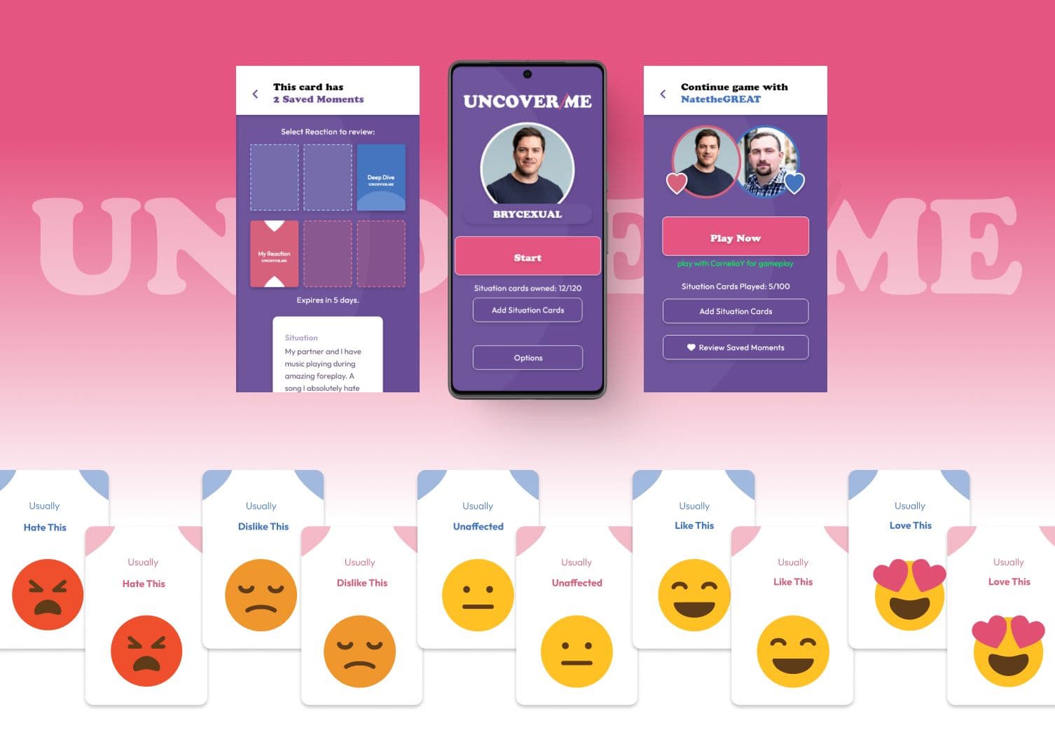 Uncover Me had a successful physical product but wanted to bring that same depth of connection to mobile users. They provided us with robust user personas and user flows, but needed a team to bring it all to life—digitally. Paper Crane jumped in, eager to design an intuitive app experience that mirrors the intimacy of the card game and gives Uncover Me’s team an opportunity to market expansion packs to grow their revenue potential.
